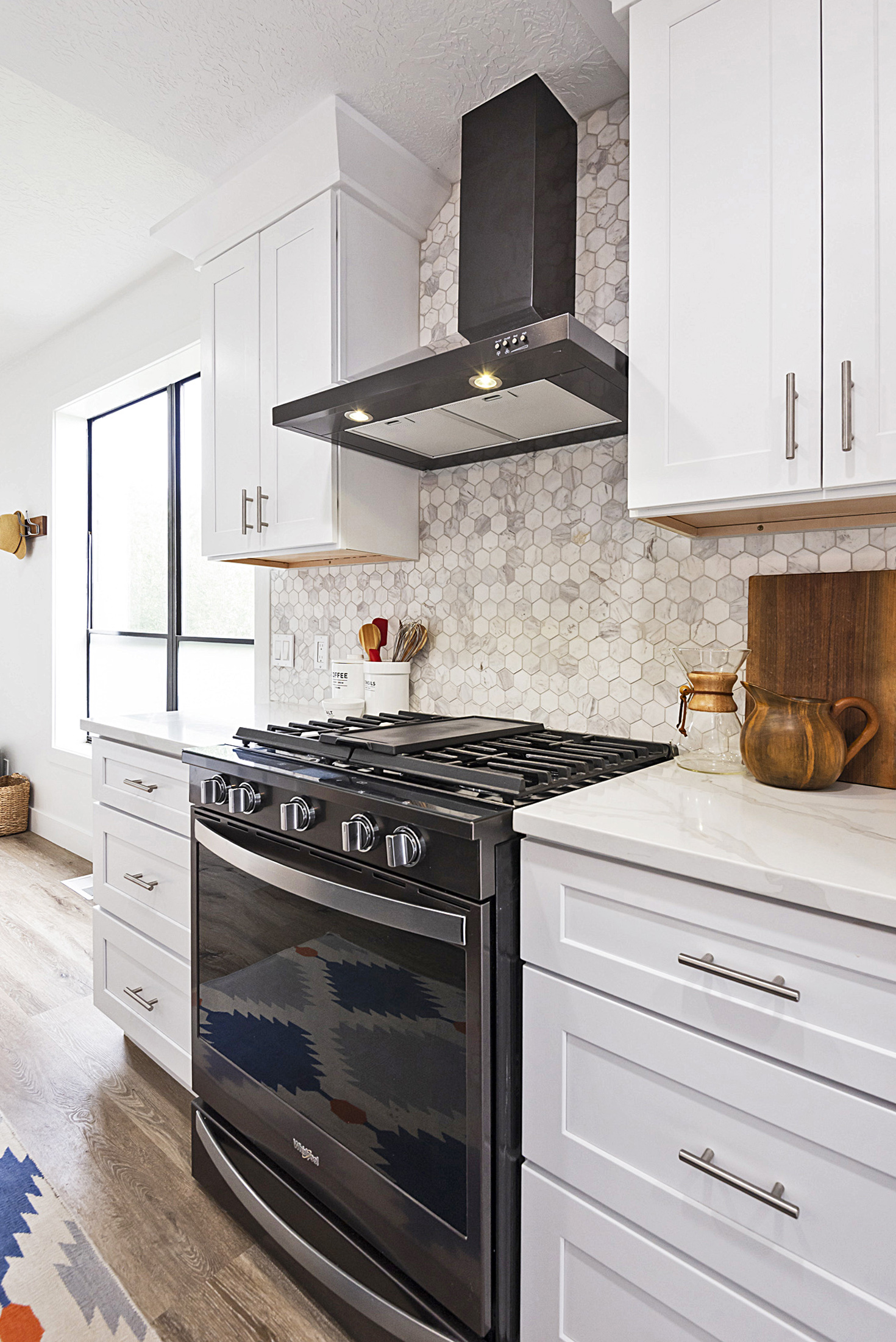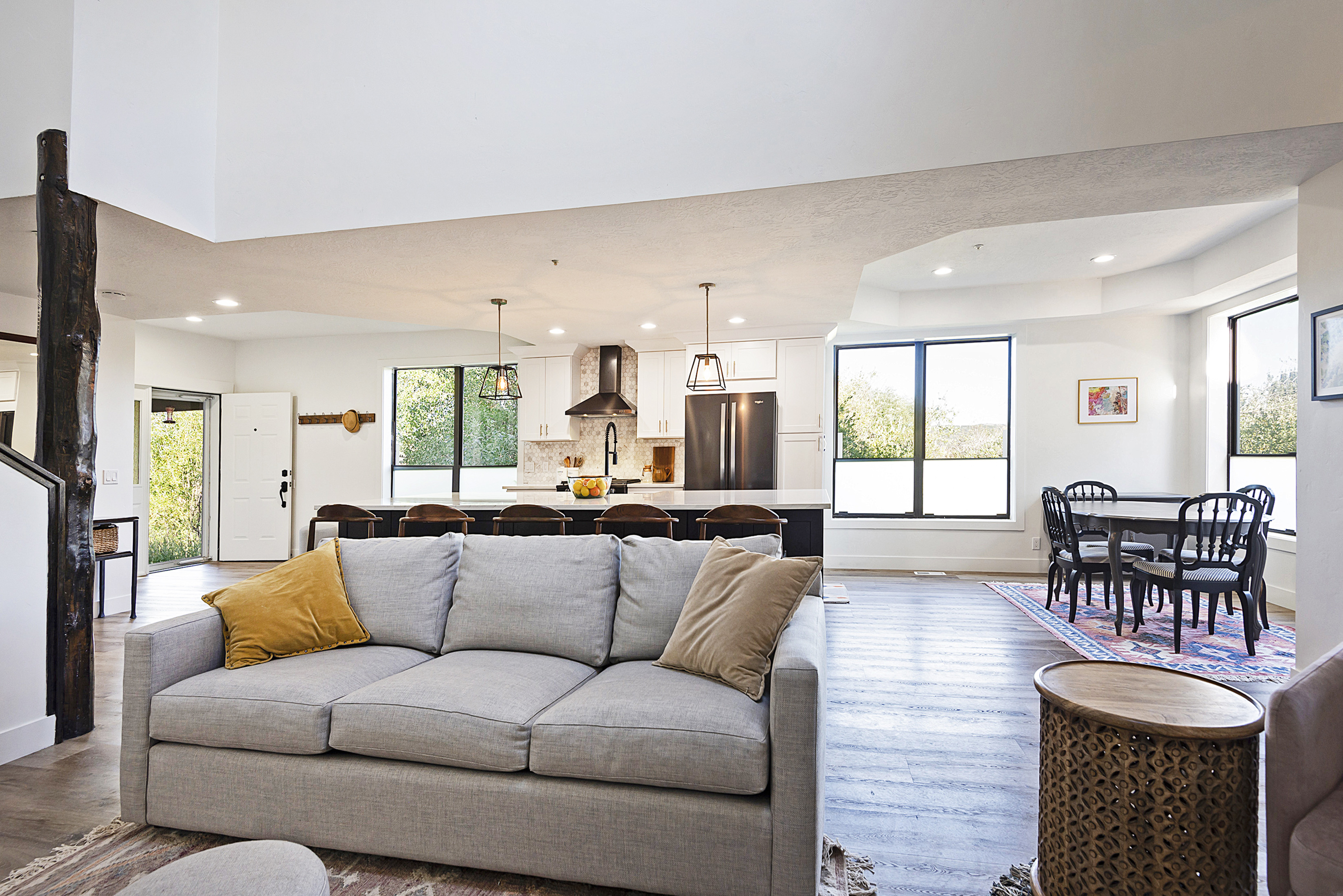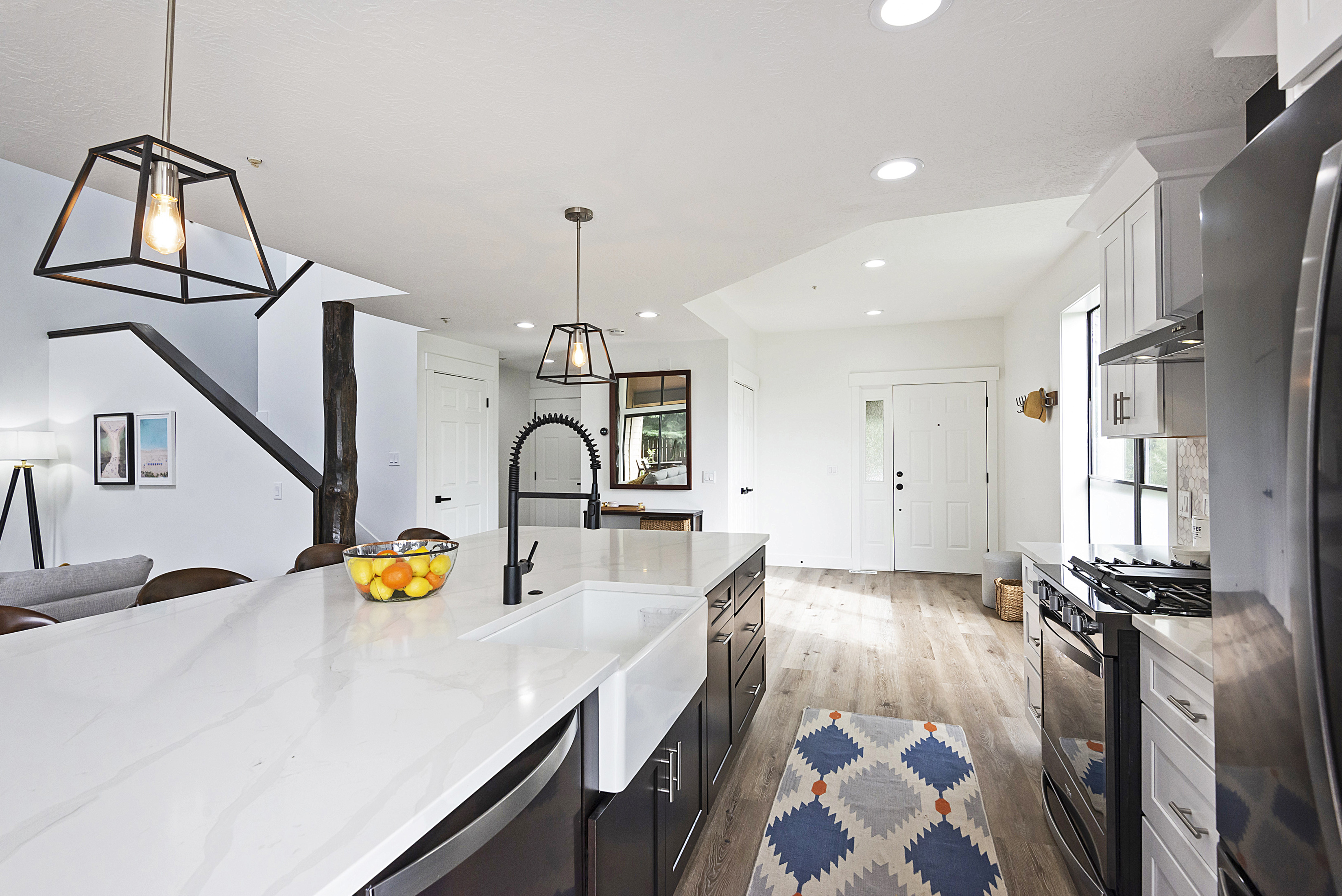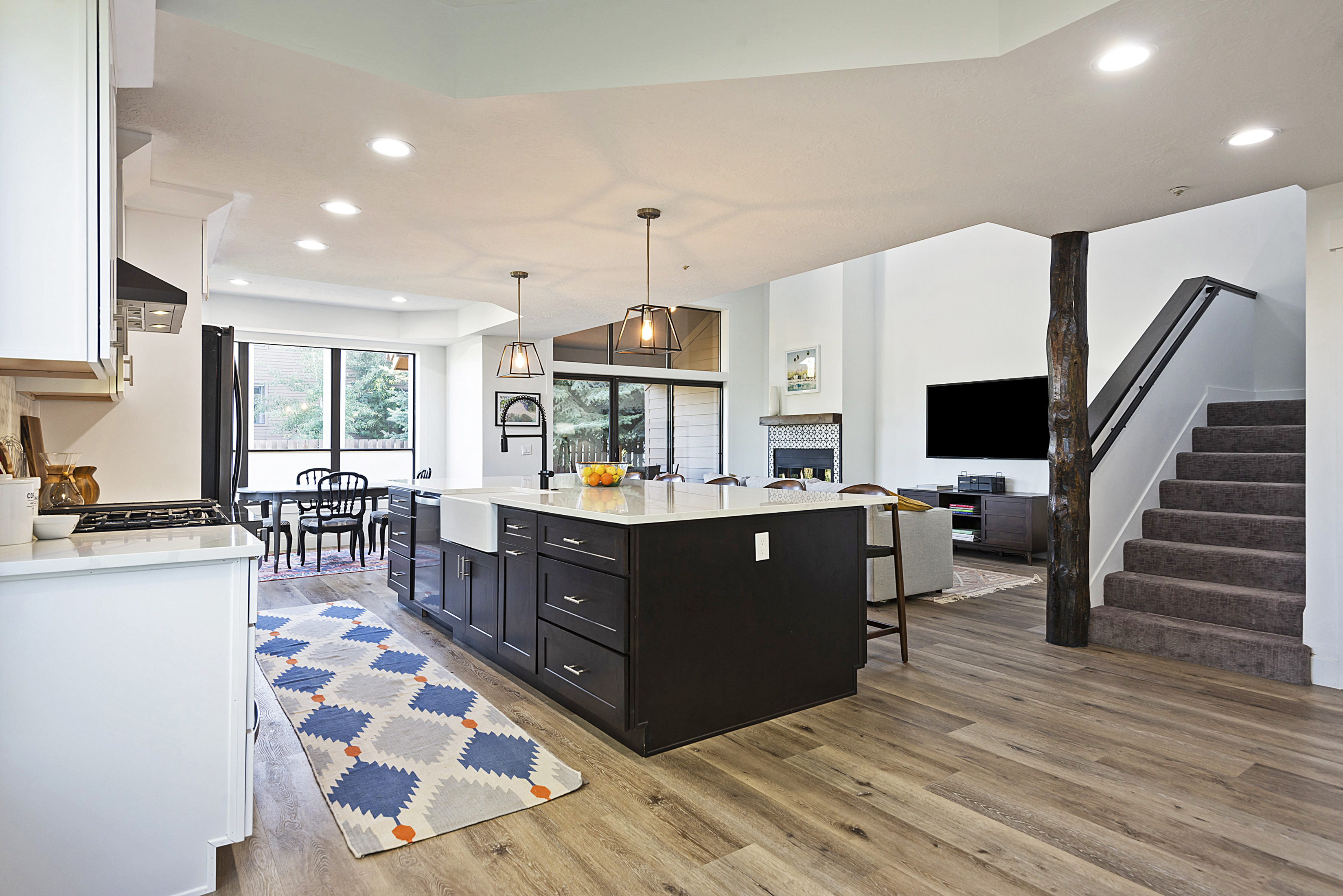 Hummingbird Homes completely remodeled this beautiful Silver Springs home, opening up the main floor plan and basement floor plan, and reworking the master bath. Our palette inspiration for this project was: Black/White/Wood, and we added touches of color in the furniture, rugs and accessories. We created a “great room” delivering an open concept kitchen/dining/living room, with an updated fireplace surround featuring an eye catching high-end encaustic tile and repurposed railroad tie mantel. The new kitchen features a GIANT island, a cooks dream, with a gorgeous quartz counter top, high-end black stainless steel appliances, two tone cabinets, hexagon marble backsplash, beautiful matte black and stainless steel pendant lights, and a stunning matte black industrial faucet. All new finishes, trim, fixtures, flooring and paint throughout, also featuring all new matte black door hardware throughout the home.